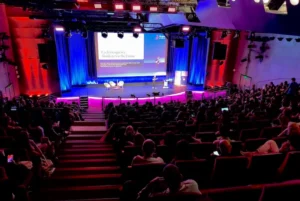 Image of a large conference from the far back with Thorsten Jonas on stage